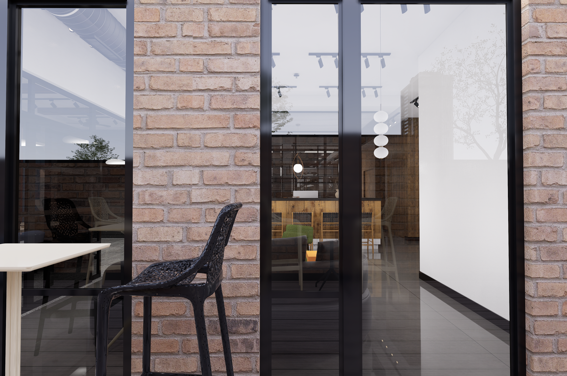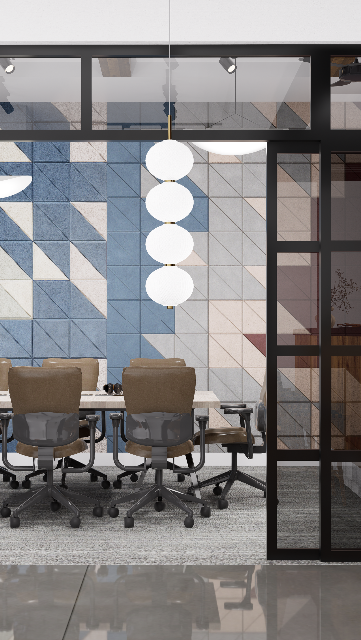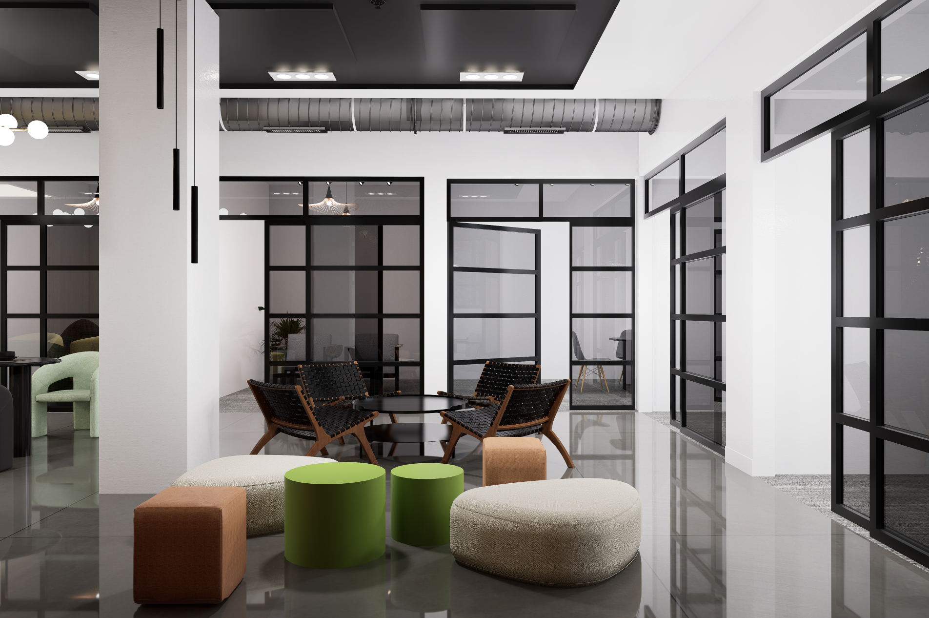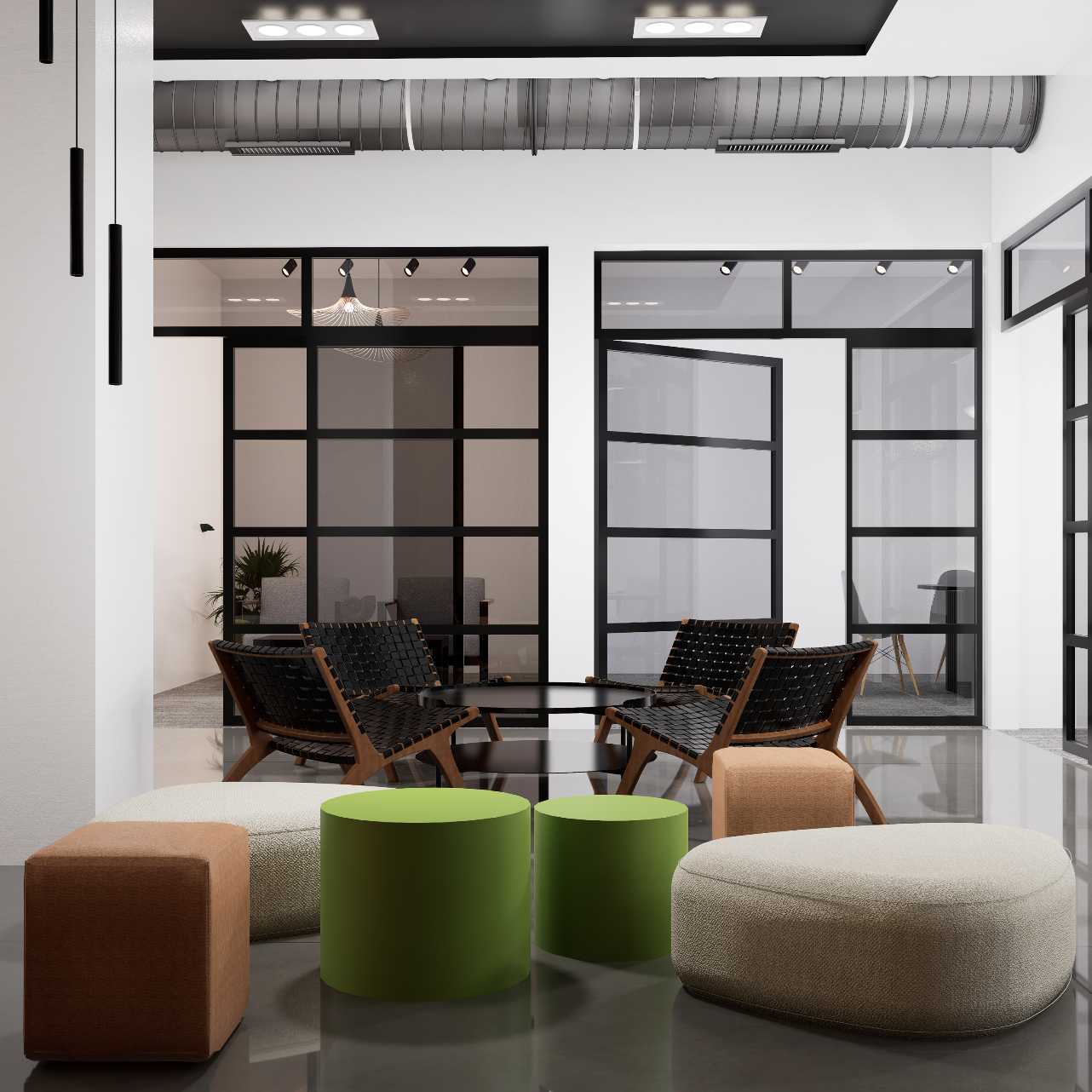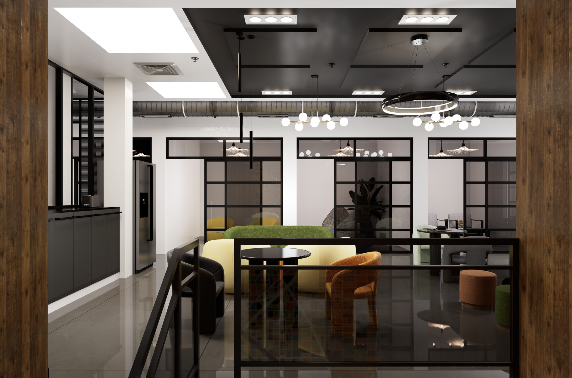 From the first visual layer, the contrast between warm wood paneling and black steel-framed glass partitions establishes structure and rhythm. These architectural interventions were intentionally introduced to define zones while preserving openness and light flow.