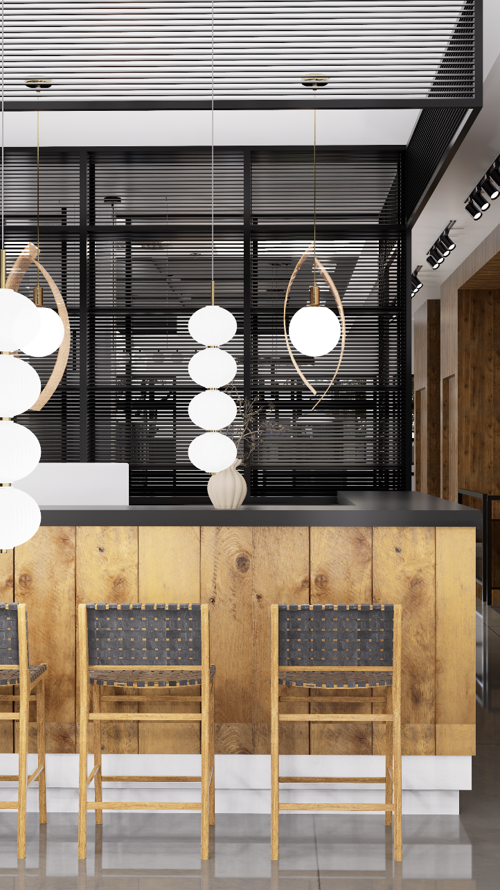 The reception bar serves as a central anchor. Wrapped in richly grained wood and framed with a clean, dark countertop, it immediately communicates warmth and approachability. Above it, sculptural pendant lighting creates vertical emphasis and visual hierarchy. The layered globe fixtures and statement pendants were carefully selected and positioned to reinforce scale and elegance.