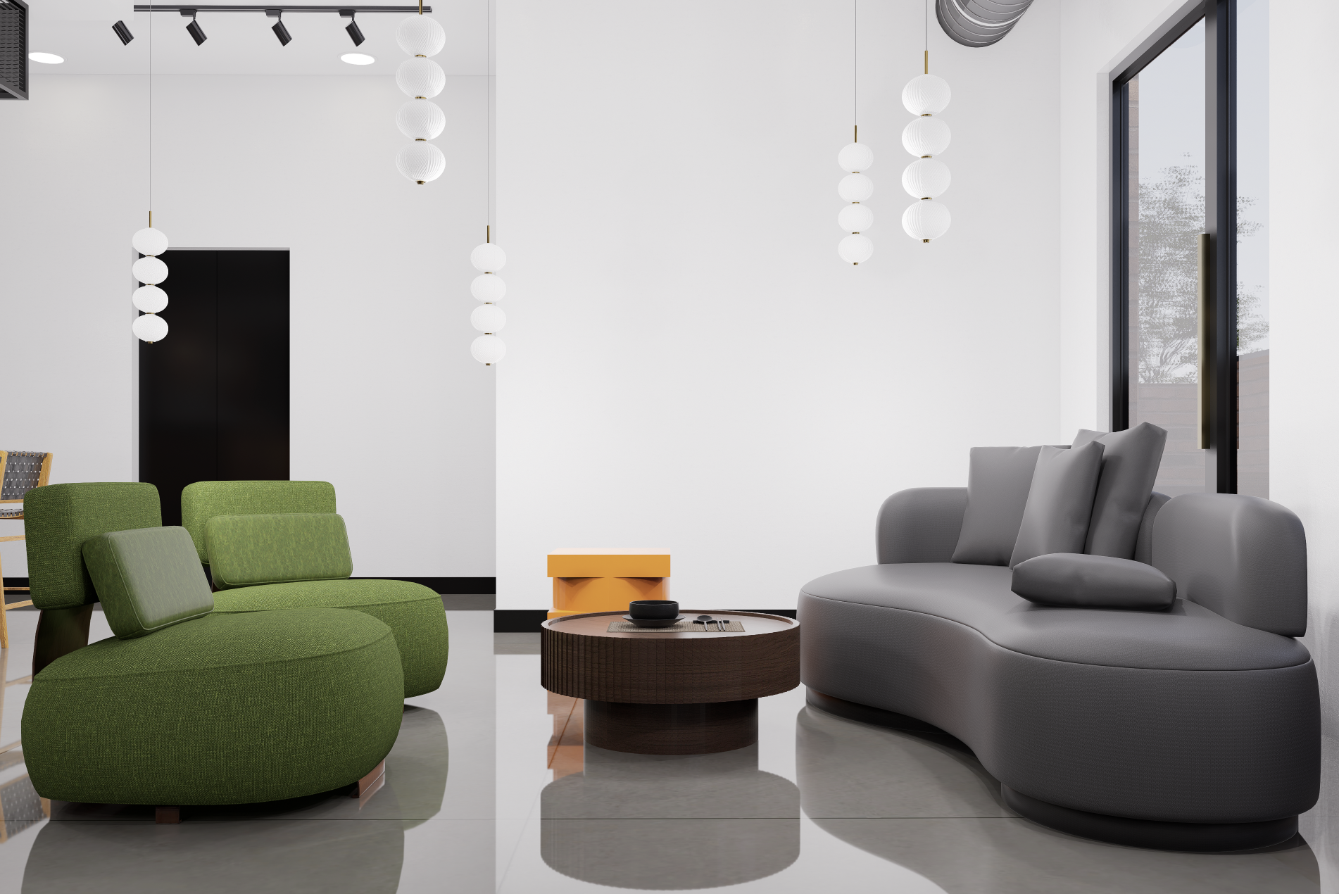 Curved lounge seating in green and neutral tones softens the linear architecture. These organic forms introduce movement and encourage relaxed conversation. The low-profile sofas and rounded chairs were chosen intentionally to create intimacy within a larger open-plan layout.