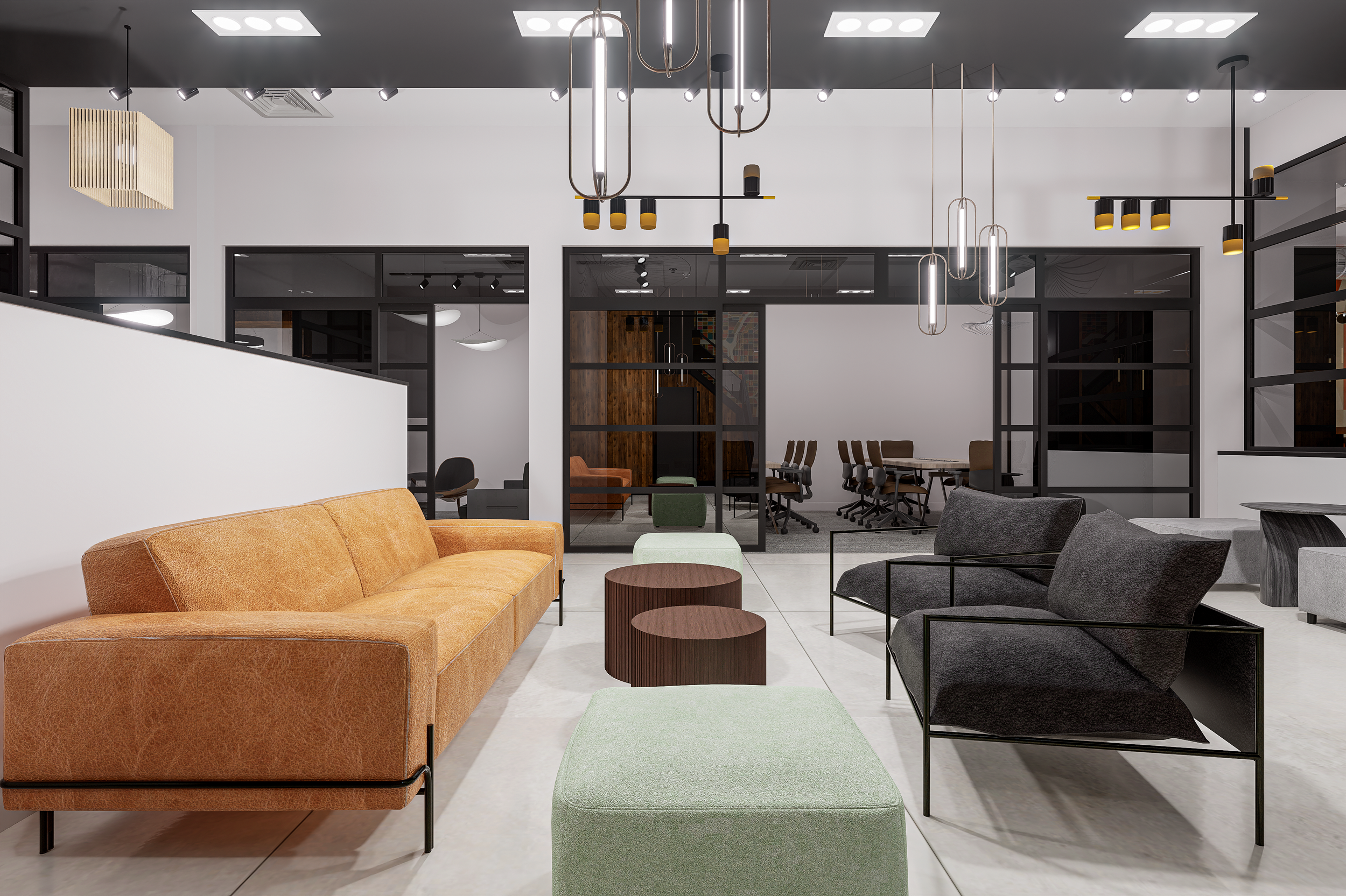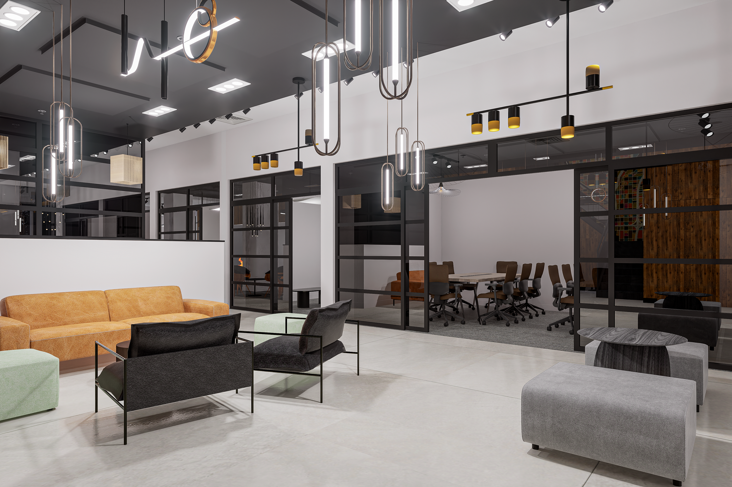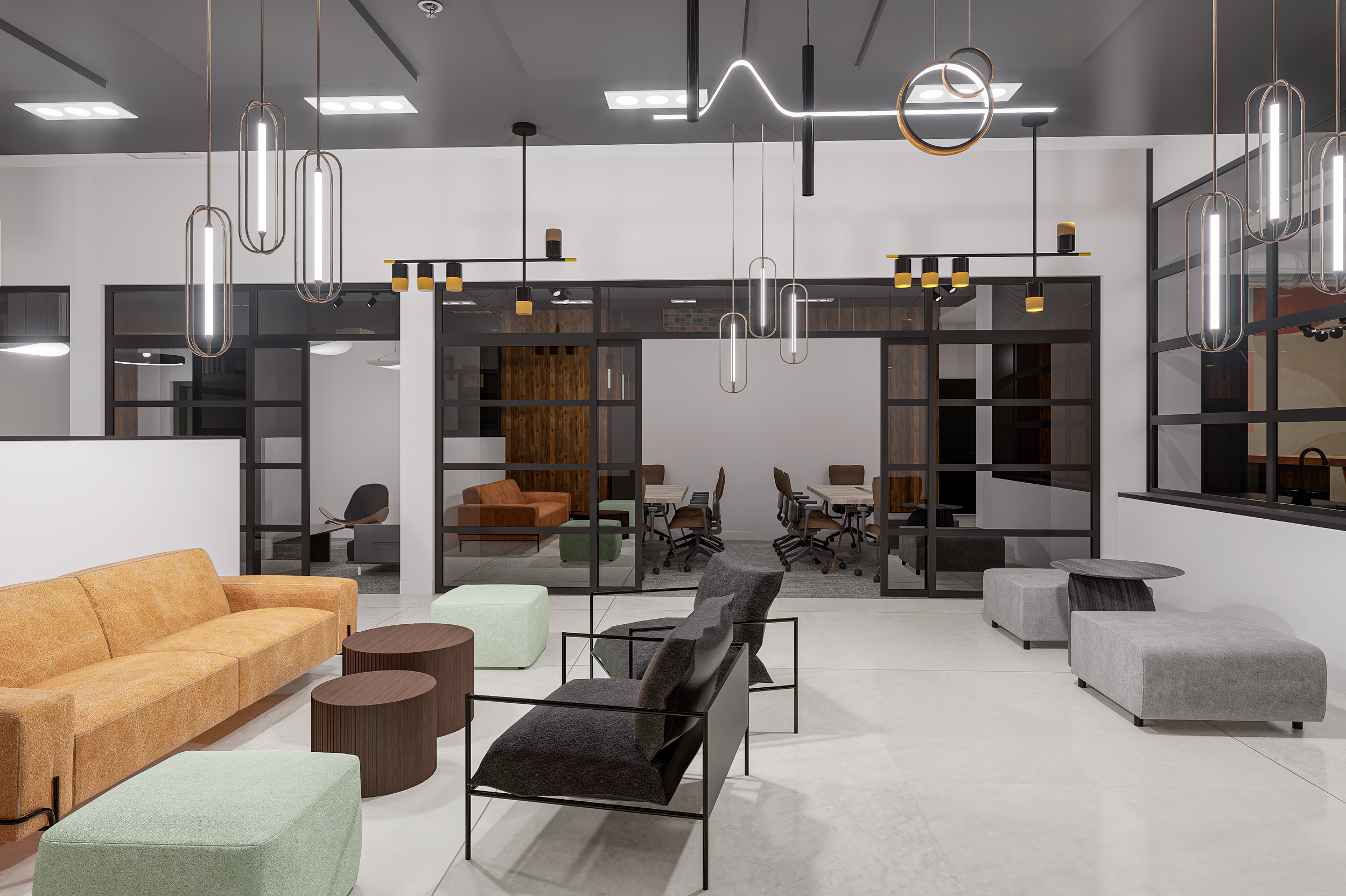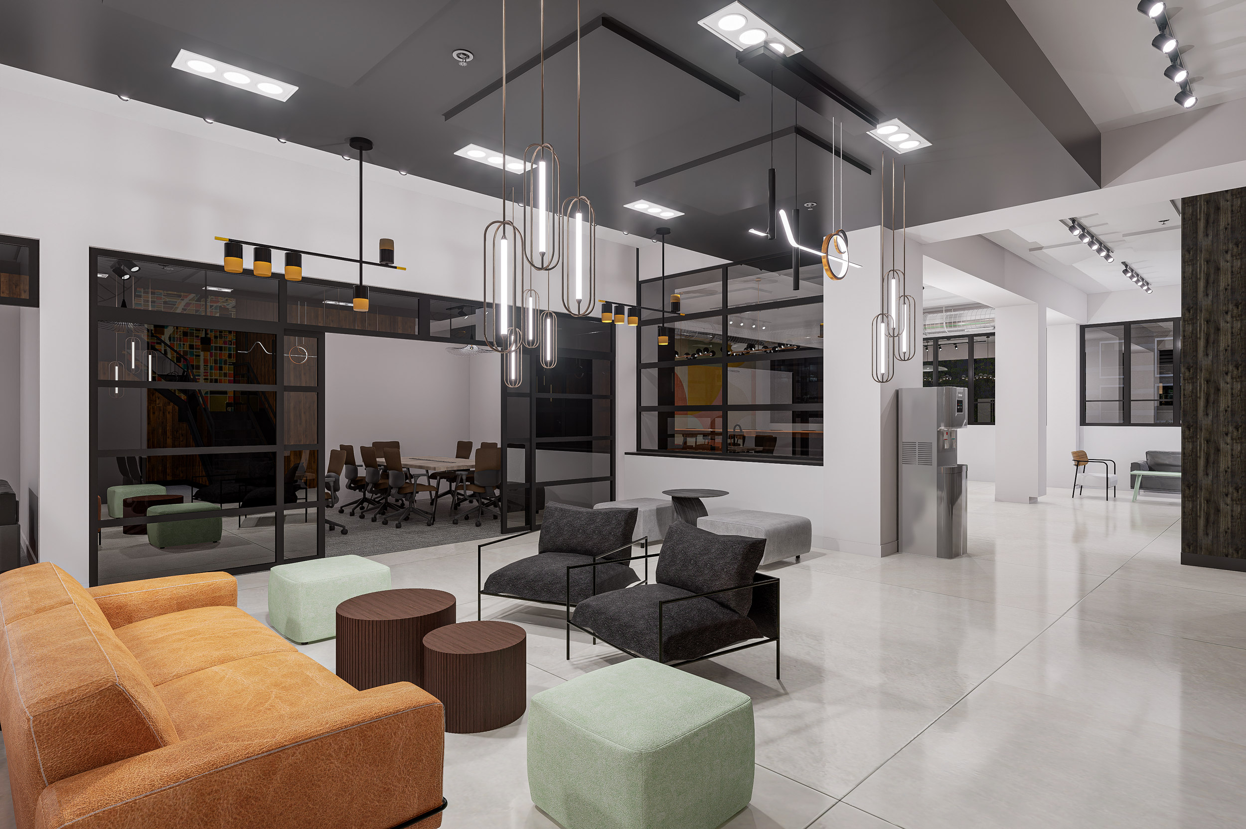 Lighting plays a defining role in execution. Linear pendants, sculptural fixtures, and track lighting were layered to support task visibility while creating architectural interest overhead. In co-working environments, lighting must do more than illuminate—it must reduce fatigue, define zones, and visually organize the ceiling plane.