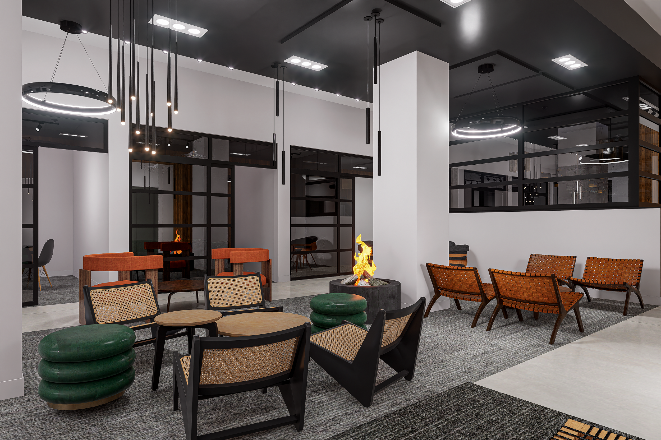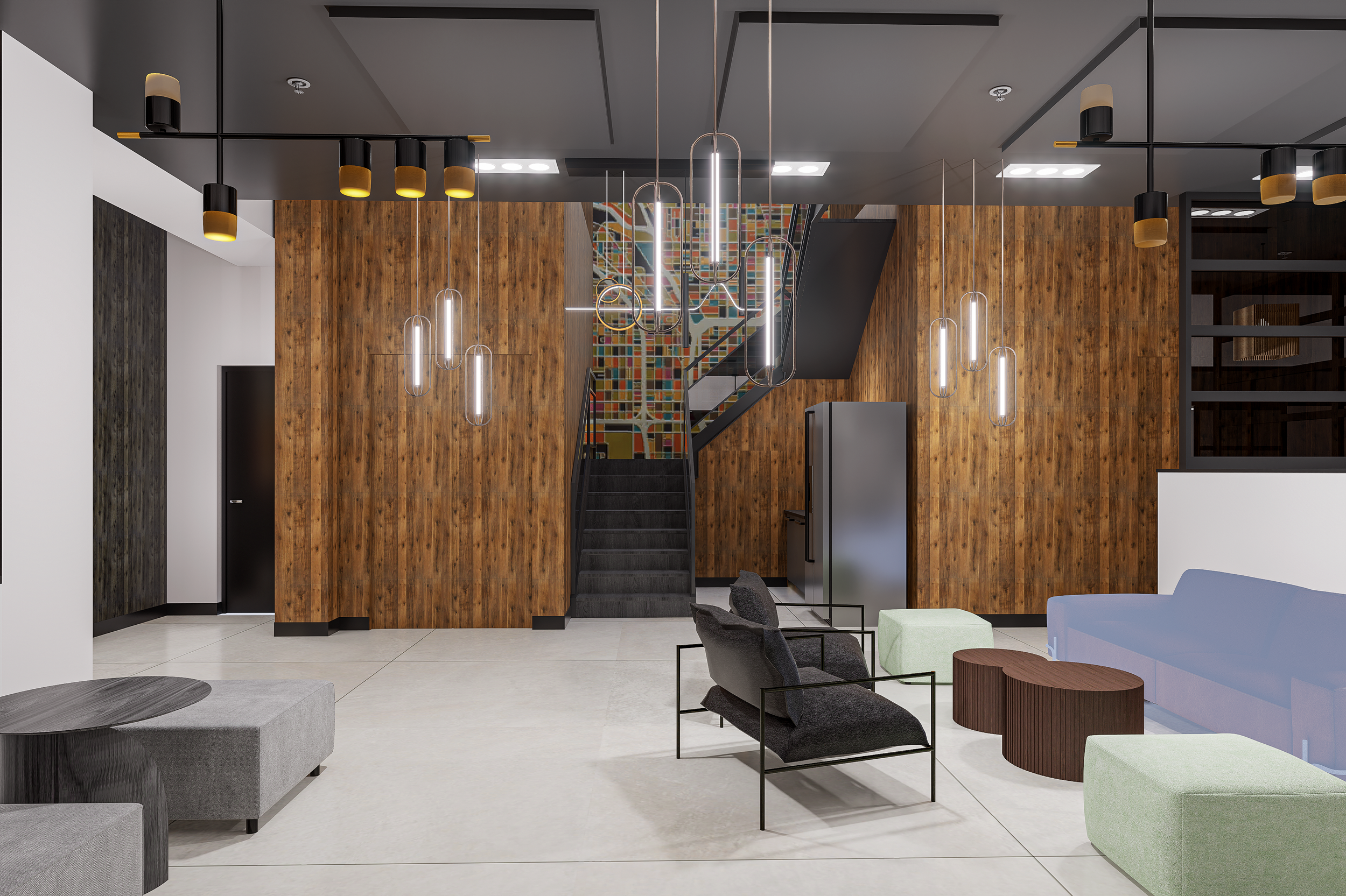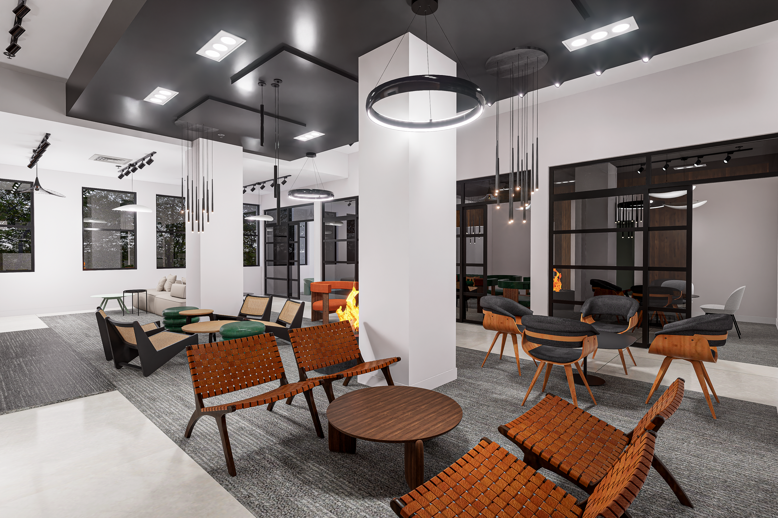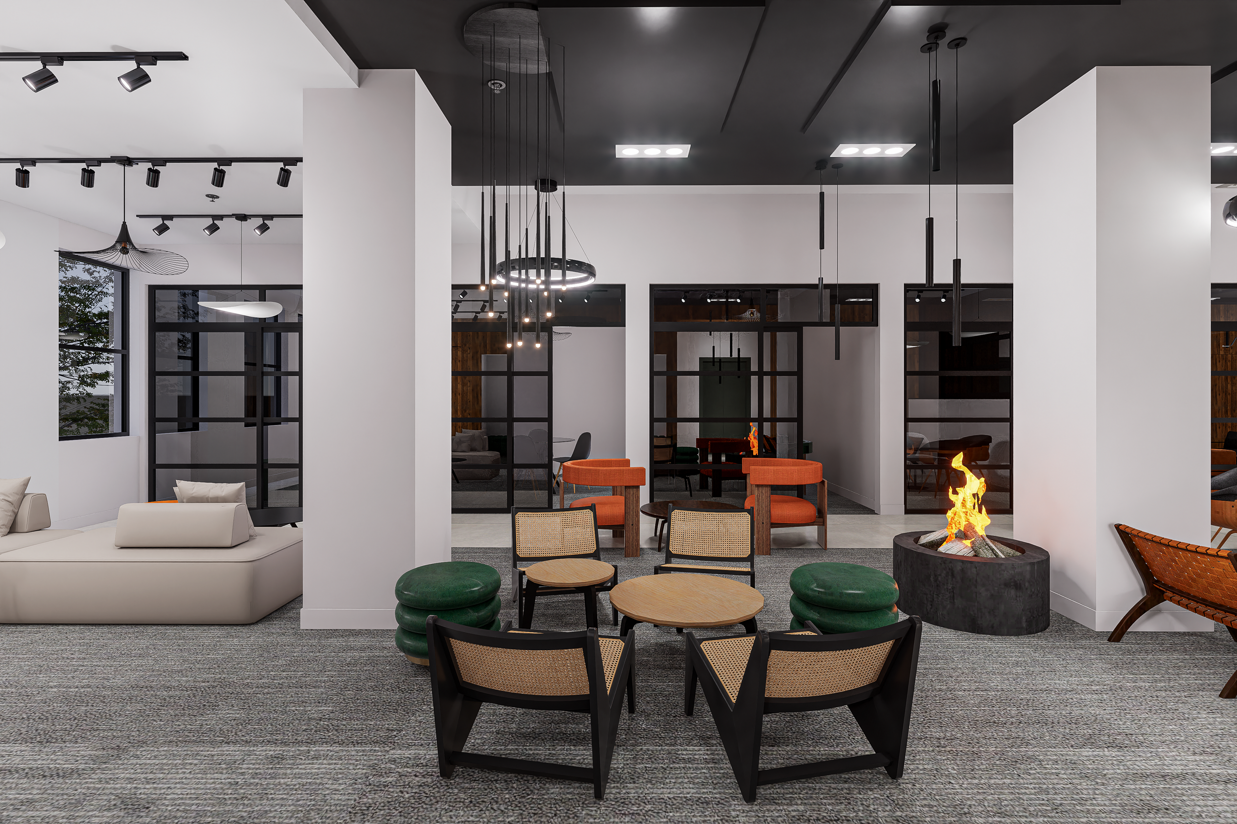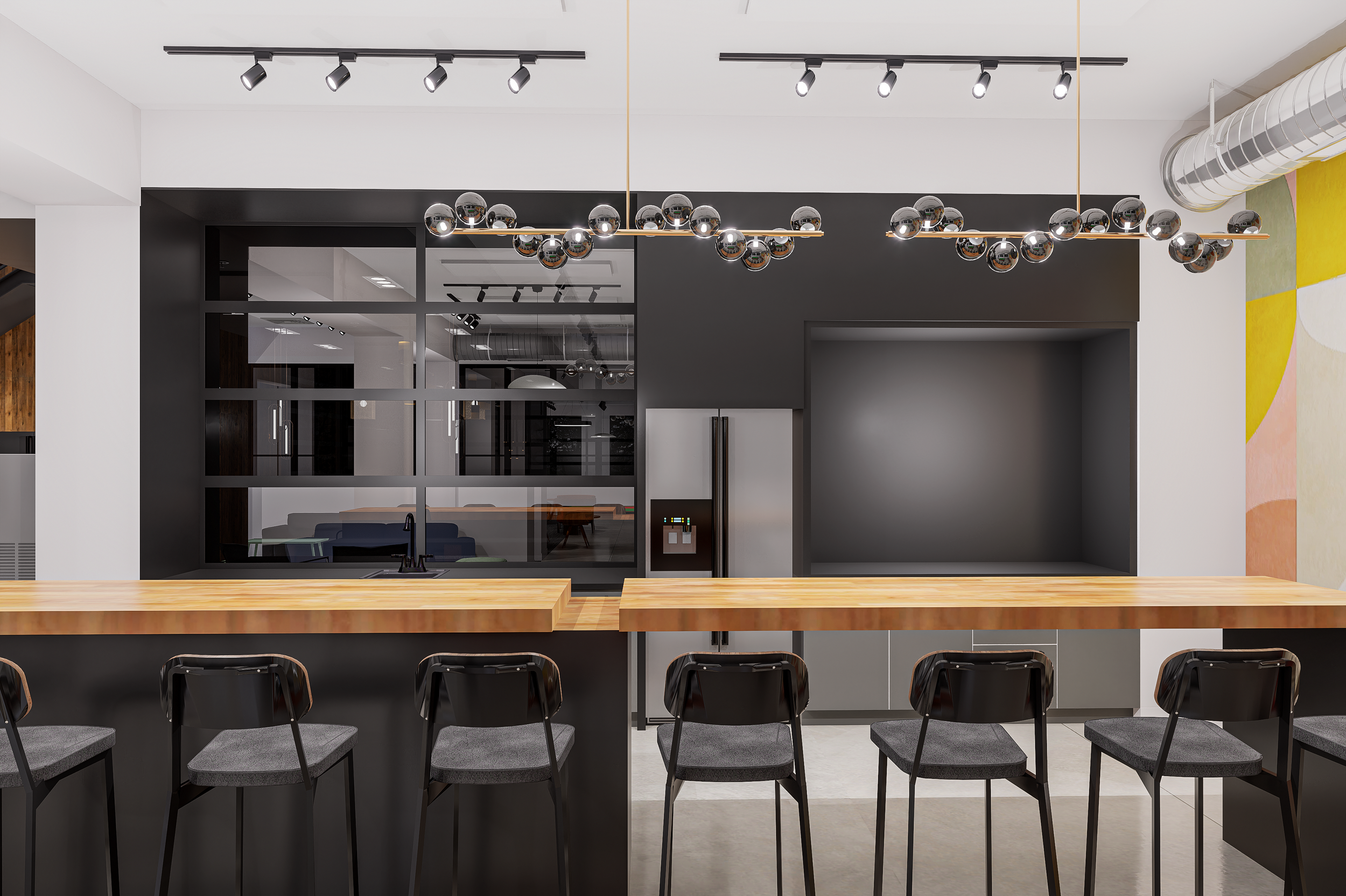 Lighting plays a defining role in execution. Linear pendants, sculptural fixtures, and track lighting were layered to support task visibility while creating architectural interest overhead. In co-working environments, lighting must do more than illuminate—it must reduce fatigue, define zones, and visually organize the ceiling plane.