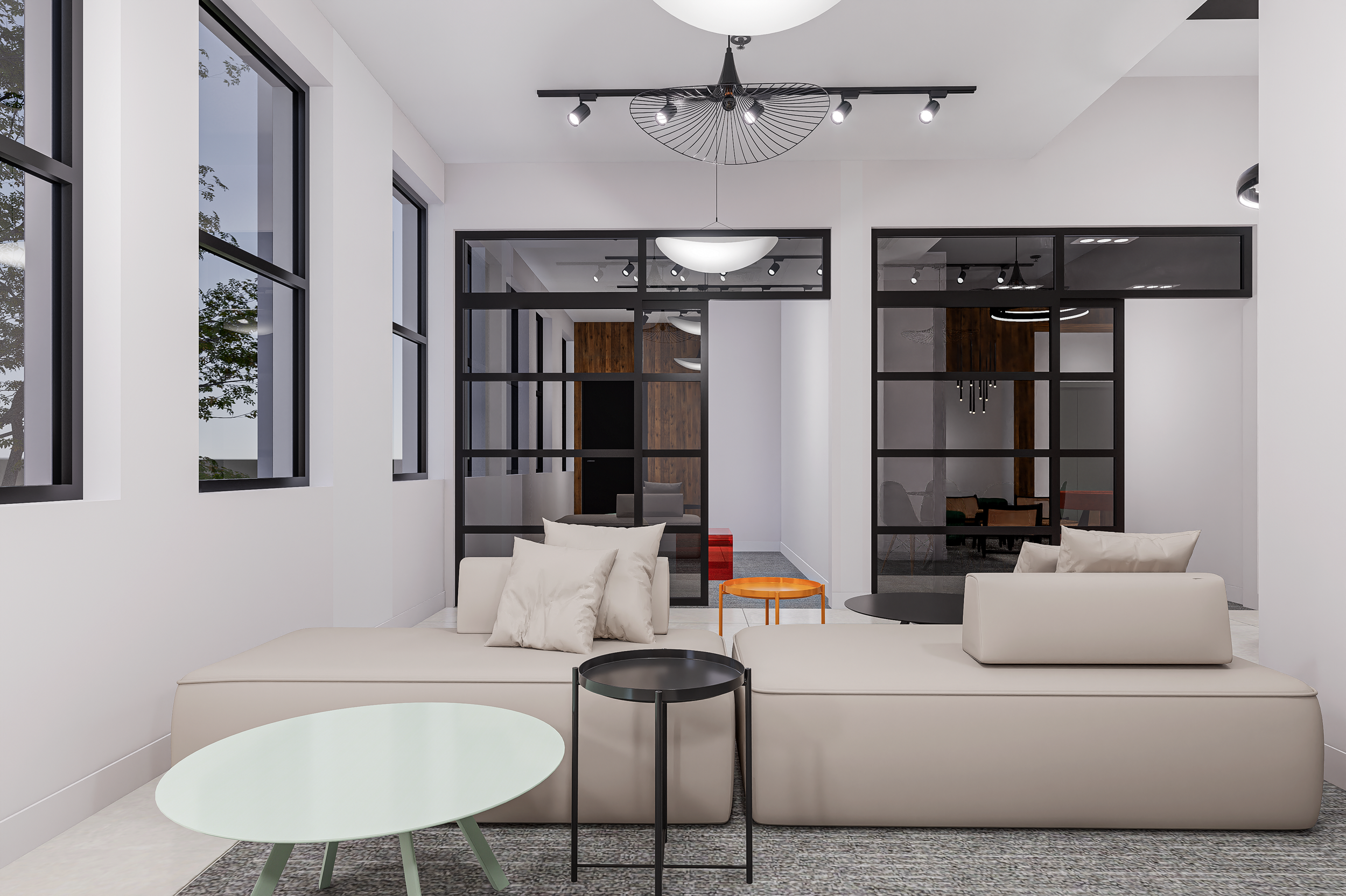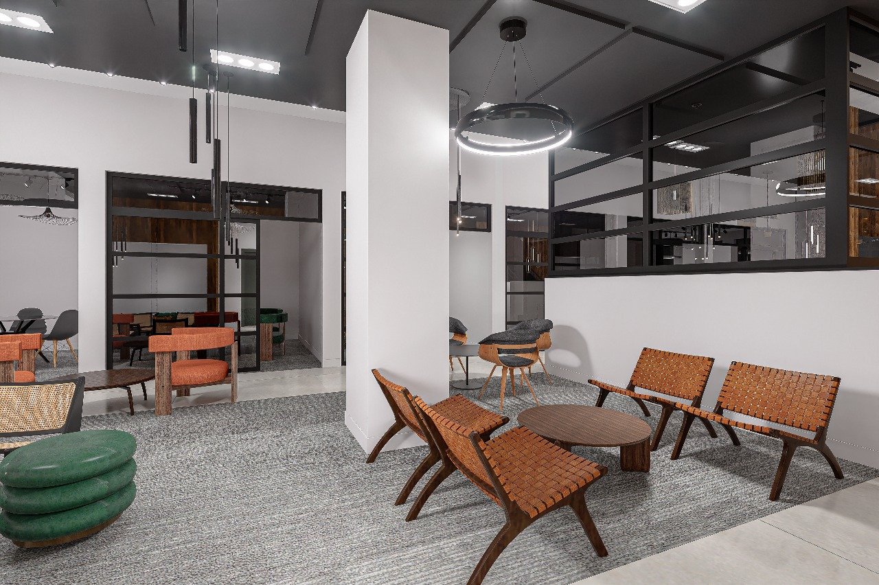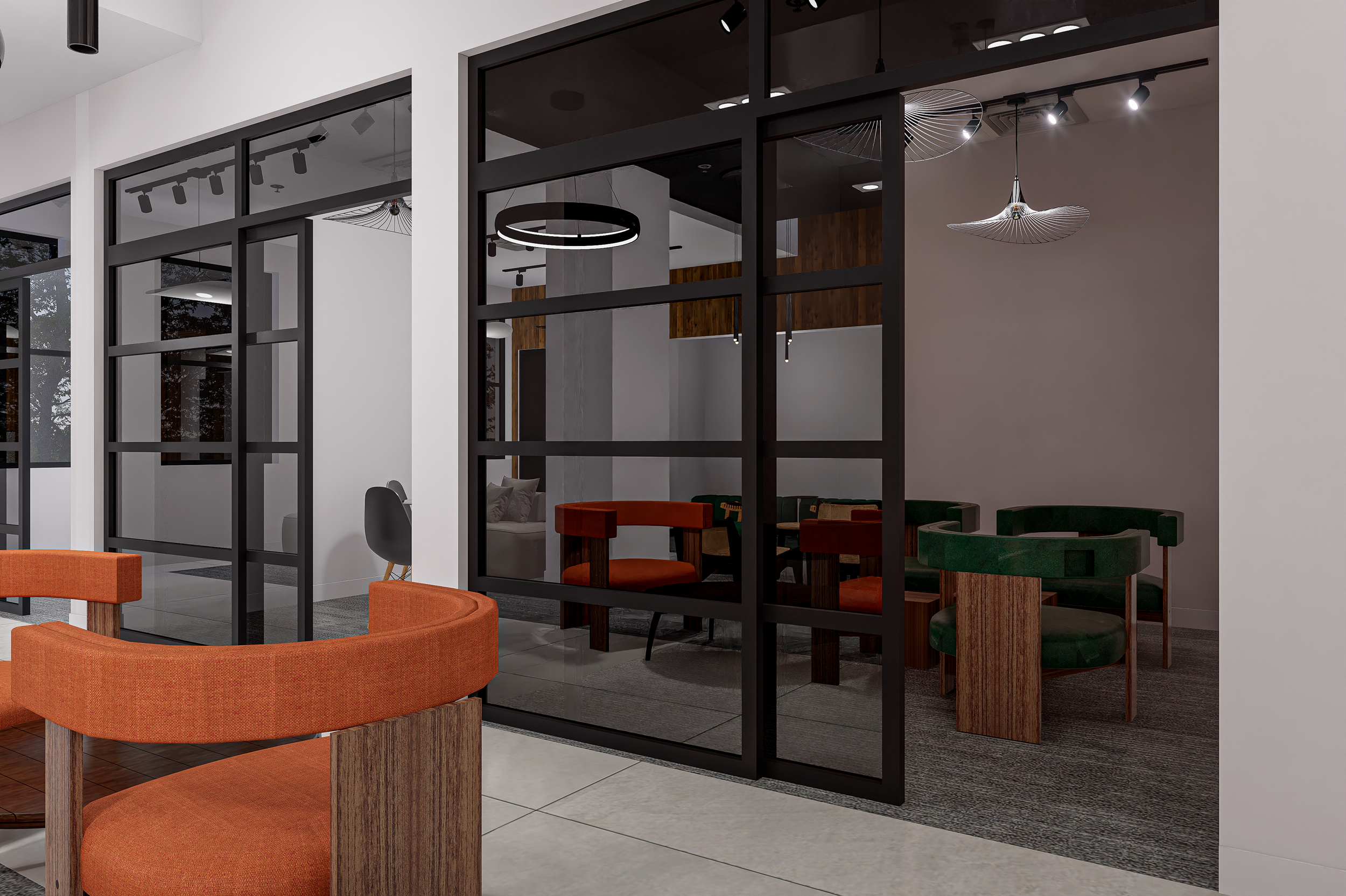 Designing a co-working floor requires a precise balance between openness and privacy. The interior design execution on the 4th floor introduces architectural framing through black steel and glass partitions to create visual structure without closing off space. Transparency was intentional. Professionals remain connected to the energy of the floor while still benefiting from acoustic separation.