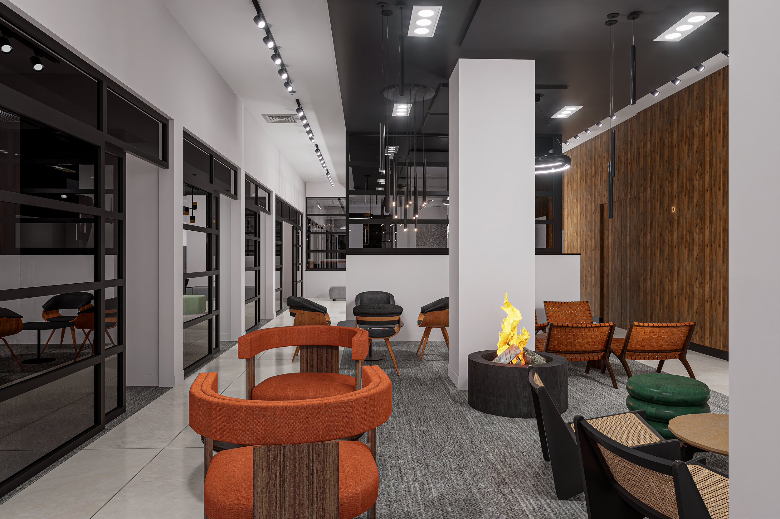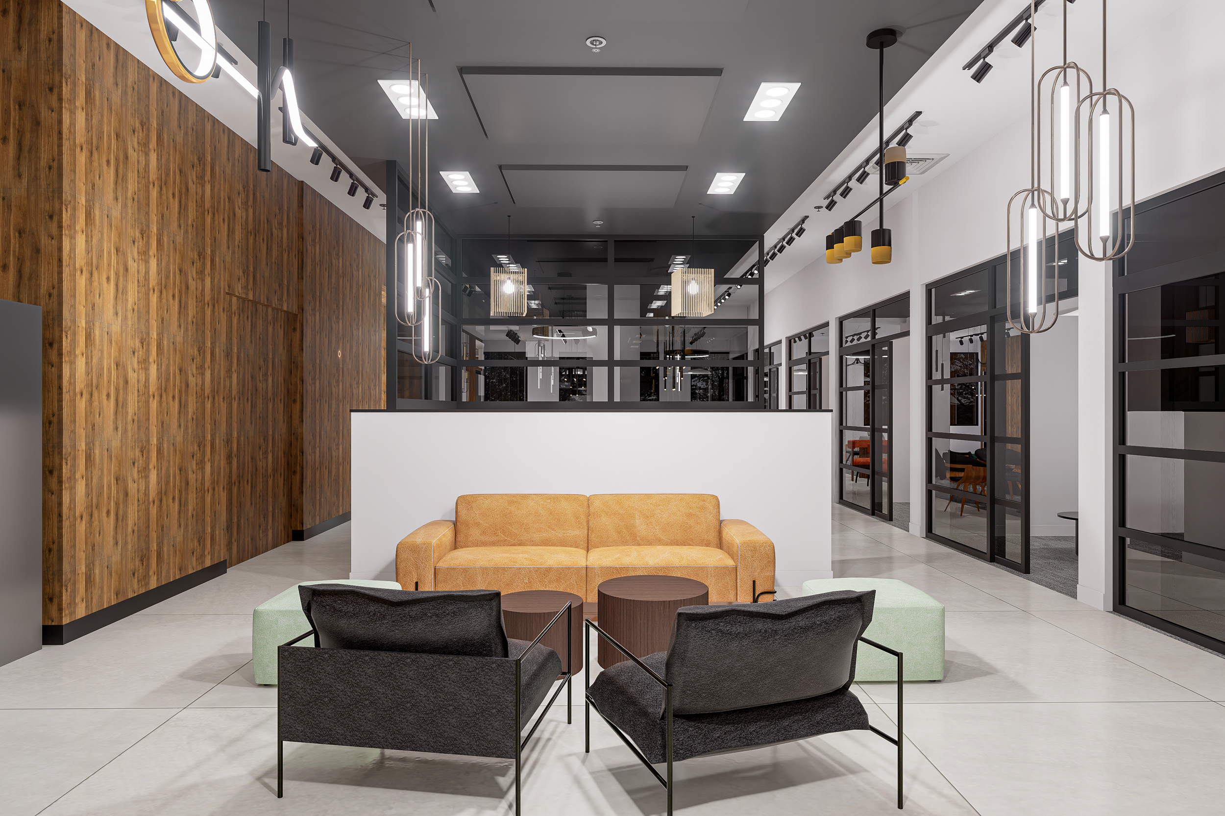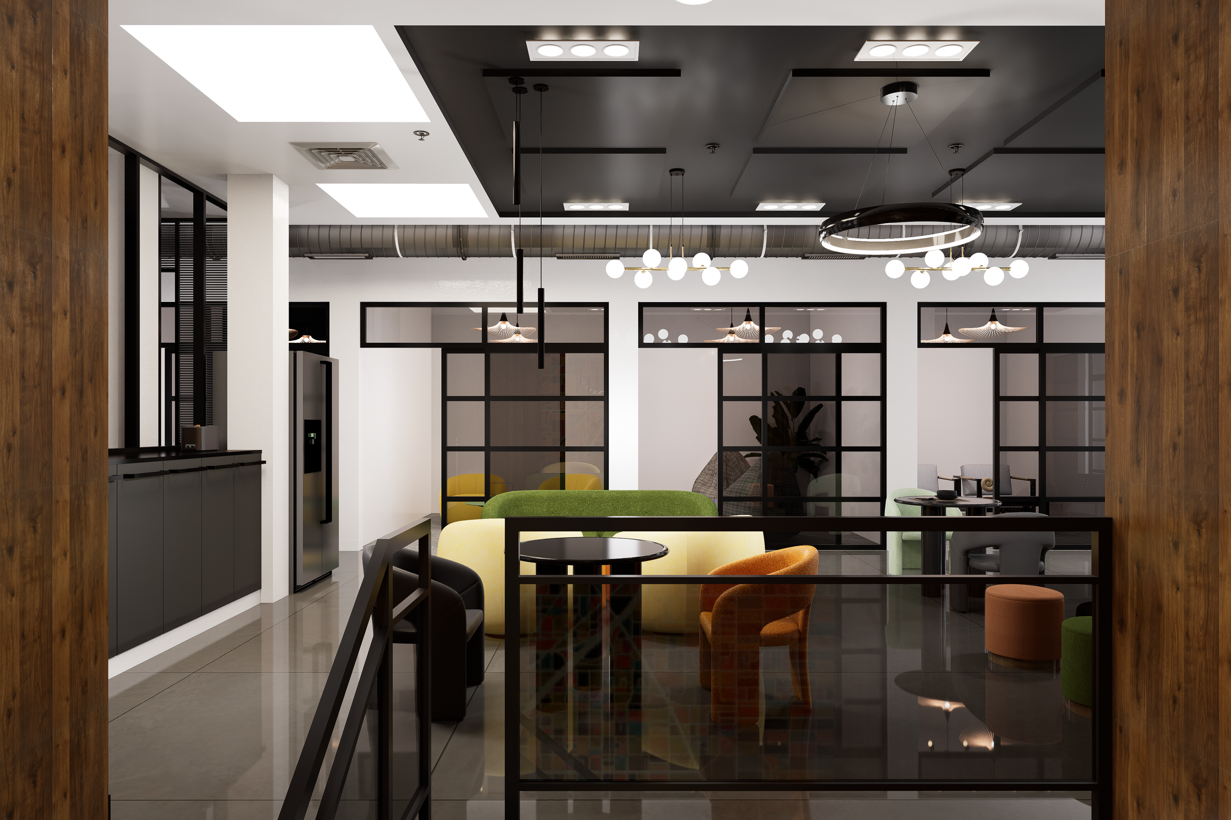 Warm wood wall cladding introduces depth and professionalism, grounding the space visually. Against it, black framing systems and matte finishes add clarity and structure. The result is a modern interior design language that feels confident and cohesive.