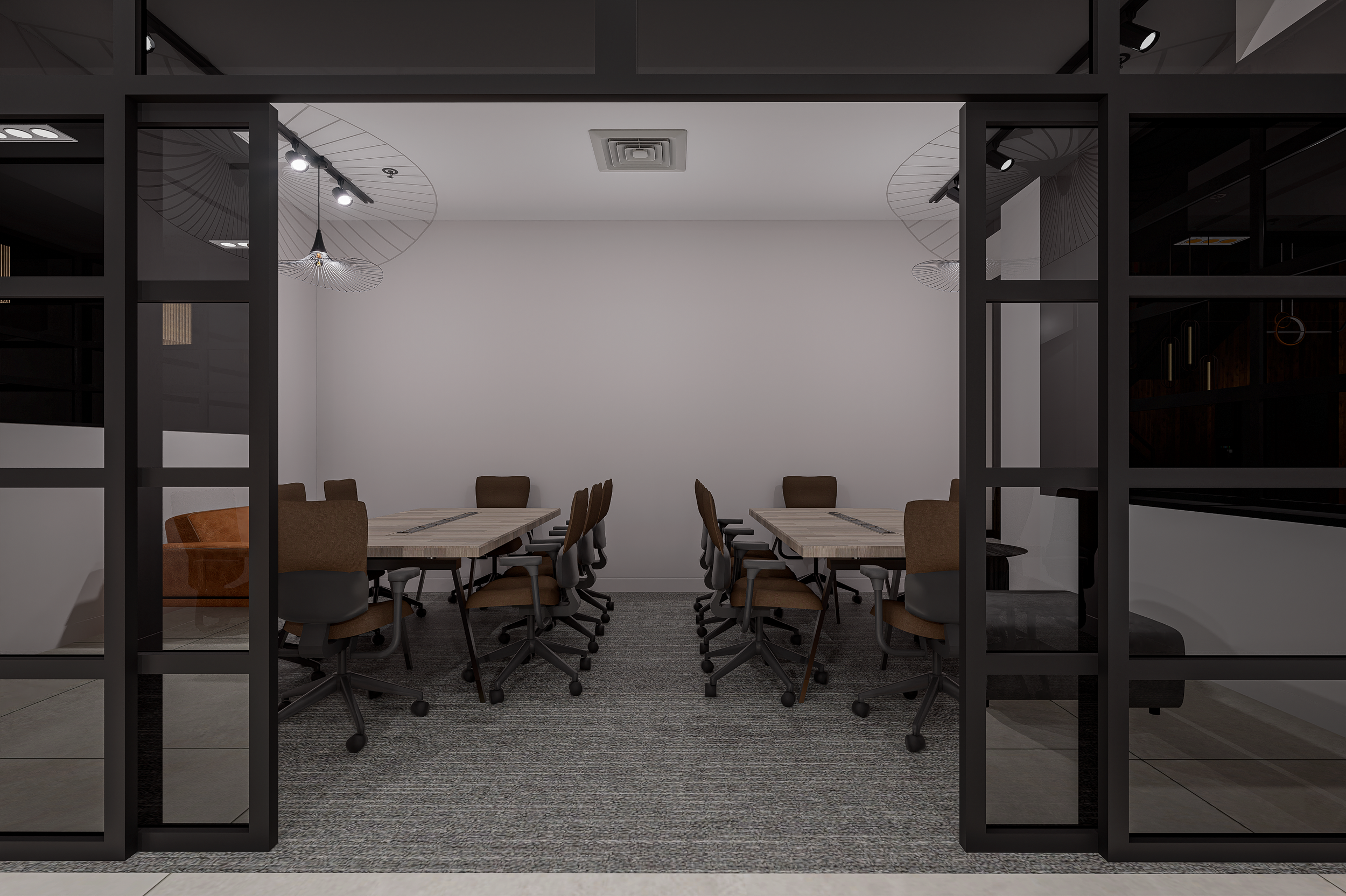 Interior design for professional co-working spaces must prioritize ergonomics. Conference rooms feature structured layouts with executive chairs, balanced lighting, and clear sightlines. The glass-enclosed meeting rooms allow teams to collaborate privately without disconnecting from the overall atmosphere.